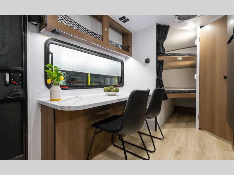 Sleeps 7 Length 22 ft 11 in Ext Width 7 ft 6 in Ext Height 10 ft 2 in Hitch Weight 497 lbs GVWR 4700 lbs Dry Weight 3770 lbs Cargo Capacity 930 lbs Fresh Water Capacity 52 gals Grey Water Capacity 27 gals Black Water Capacity 27 gals Number Of Bunks 2 Available Beds Murphy Bed Refrigerator Type 12V Refrigerator Size 10 cu ft Cooktop Burners 2 Number of Awnings 1 LP Tank Capacity 20 lbs Water Heater Type On Demand Tankless AC BTU 15000 btu Awning Info 15' Power w/LED Lights Axle Count 1 Number of LP Tanks 2 Shower Type Tub/Shower Combo Electrical Service 55 amp Solar Wattage 400 watts Similar Floorplans