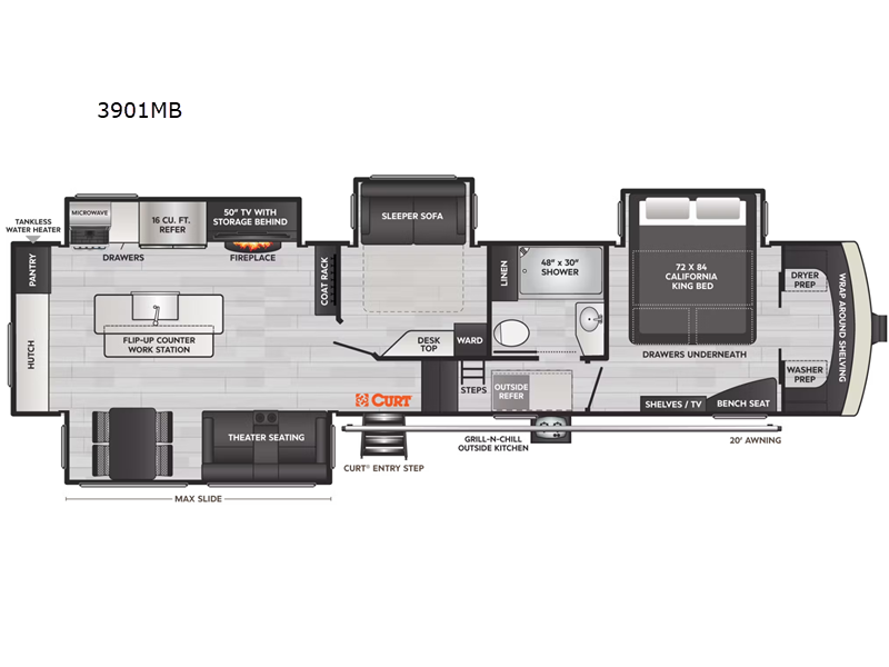 Camping trips can be spent in luxury with this fifth wheel in tow! There are four slide outs providing you with tons of interior space, and the middle bedroom will be perfect for guests. There is a sleeper sofa here, a desk top, plus a wardrobe for their things, and the loft will be perfect for little ones or storage space. You will have the front private bedroom all to yourselves with a California king bed slide out, plus a walk-in closet with wrap-around shelving. There is even under bed storage and washer and dryer prep to make laundry day easier than ever. Everyone can meet in the rear kitchen and living area that includes theater seating, a free-standing dinette, and an island with a flip-up counter workstation. There is also a large hutch here and a pantry for added storage space. And we haven't even touched on the exterior; Curt entry steps, a 20' power awning, plus a Grill-N-Chill outside kitchen!